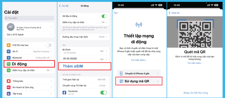 – Mở Cài Đặt (Setting) > Di Động (Cellular) > chọn Thêm eSIM (Add eSIM hoặc Add Cellular Plan) > Quét mã QR để cài eSIM vào điện thoại.