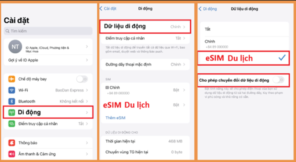 Vào Cài đặt (Setting) > chọn Di động (Cellular) > chọn Dữ liệu di động (Cellular Data) > chọn eSIM Du lịch làm sim sử dụng dữ liệu di động.