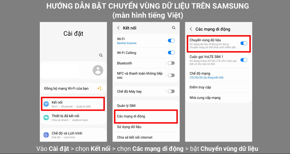 Vào mục Cài đặt (Setting) > Kết nối (Connections) > Các mạng di động (Mobile Network) > Bật Chuyển vùng dữ liệu (Data Roaming)