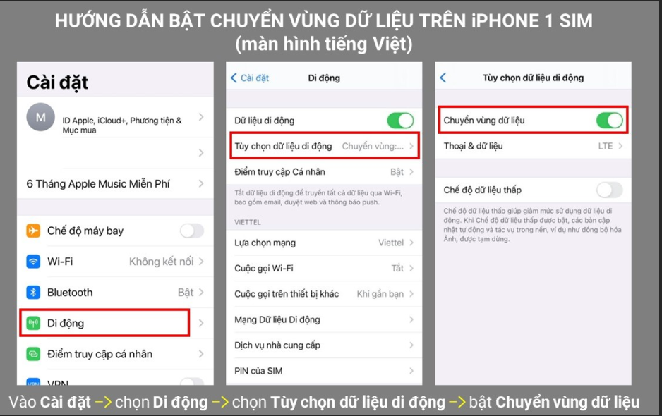 Vào mục Cài đặt (Setting) > Di Động (Cellular) > Tùy chọn dữ liệu di động (Cellular Data Options) > Bật Chuyển vùng dữ liệu (Data Roaming)