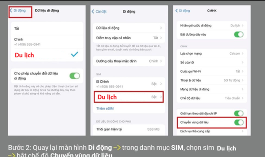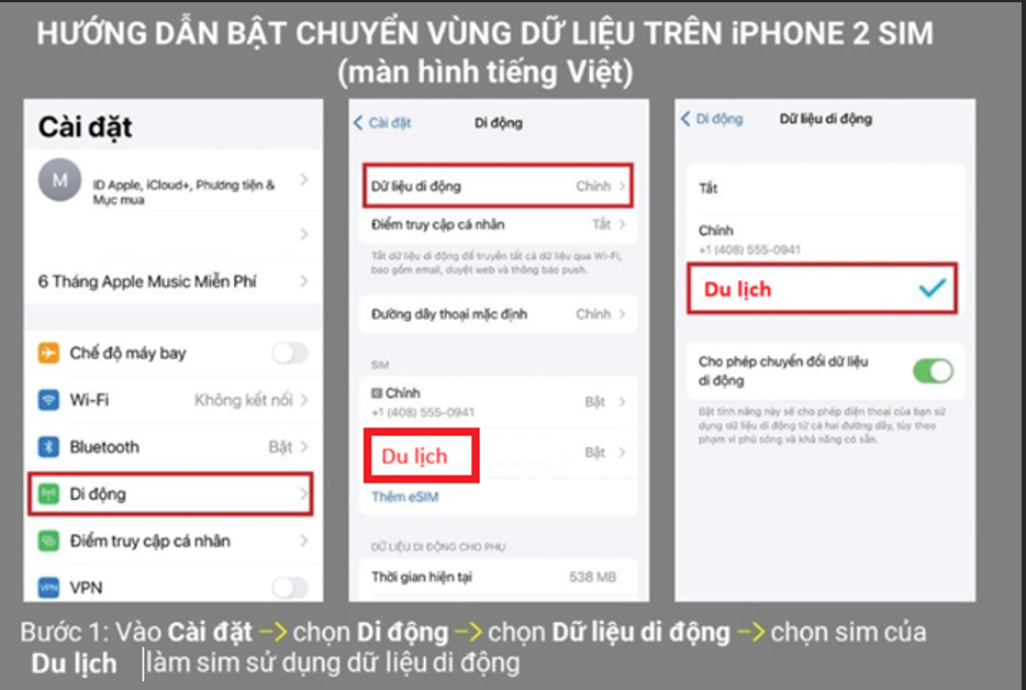 Vào mục Cài đặt (Setting) > Chọn Di Động (Cellular) > Chọn Dữ liệu di động (Cellular Data) > Chọn Du lịch là sim dùng Dữ liệu di động.